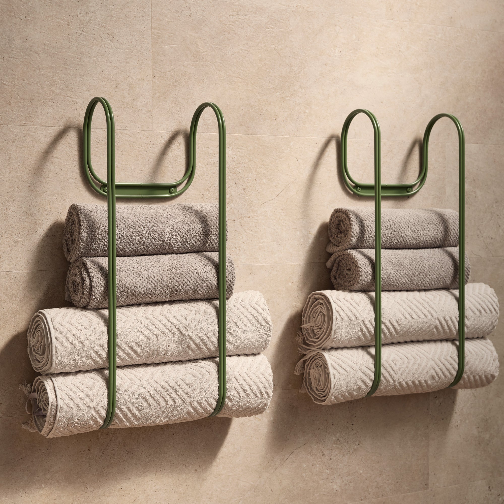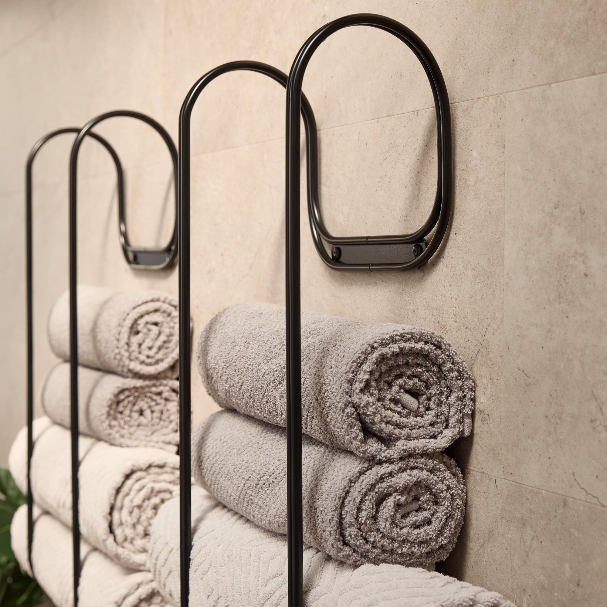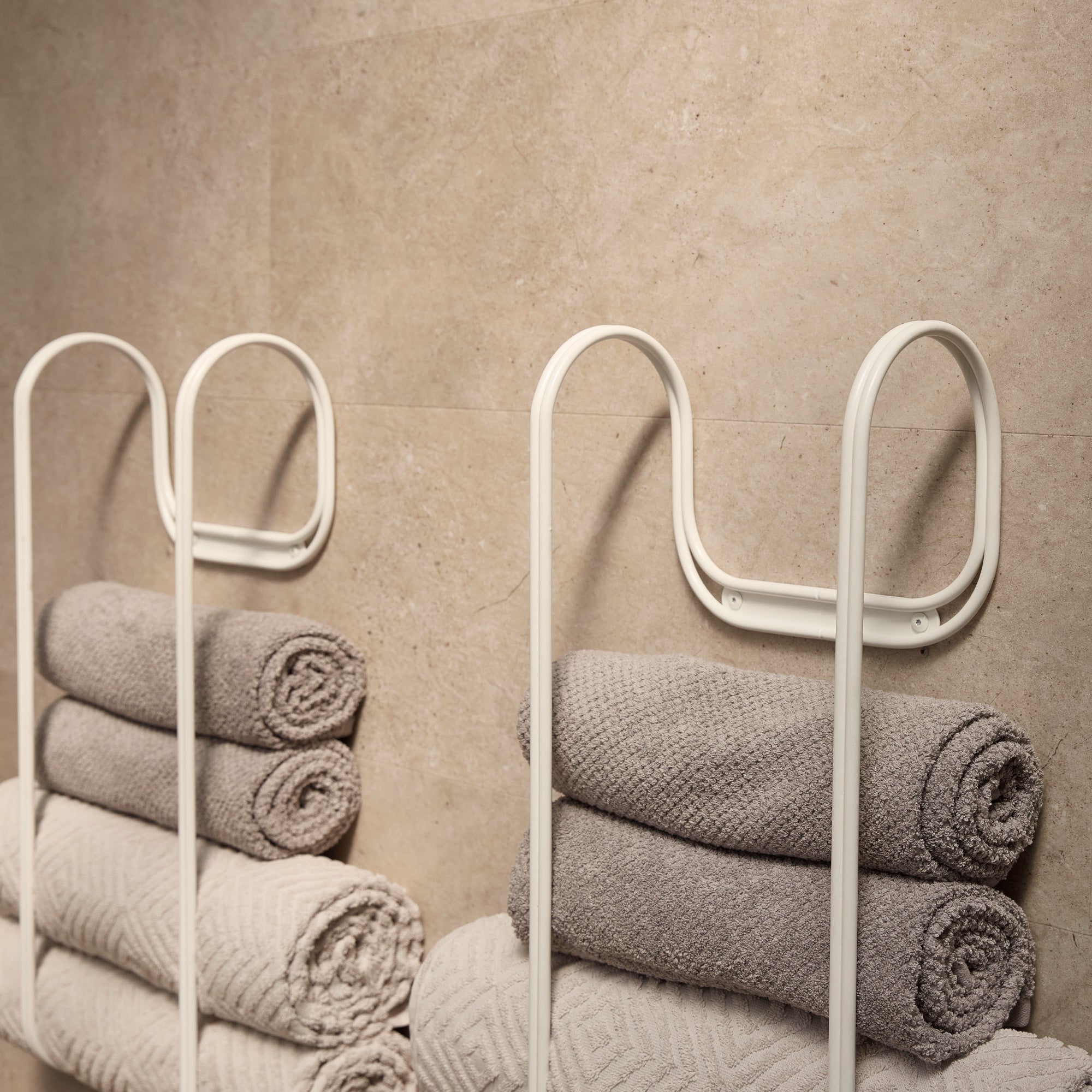 Lavna est la solution parfaite pour un rangement élégant des serviettes au mur. Le porte-serviettes moderne se fixe solidement avec seulement quatre vis et peut accueillir jusqu’à six serviettes enroulées à partir de 140x70 cm. Les petites serviettes peuvent être posées par-dessus pour gagner de la place, et même les grandes serviettes de bain trouvent élégamment leur place. Les courbes douces du cadre métallique thermolaqué et le design minimaliste permettent à Lavna de s’intégrer harmonieusement dans chaque concept de salle de bains – qu’il soit moderne, puriste ou classique.
