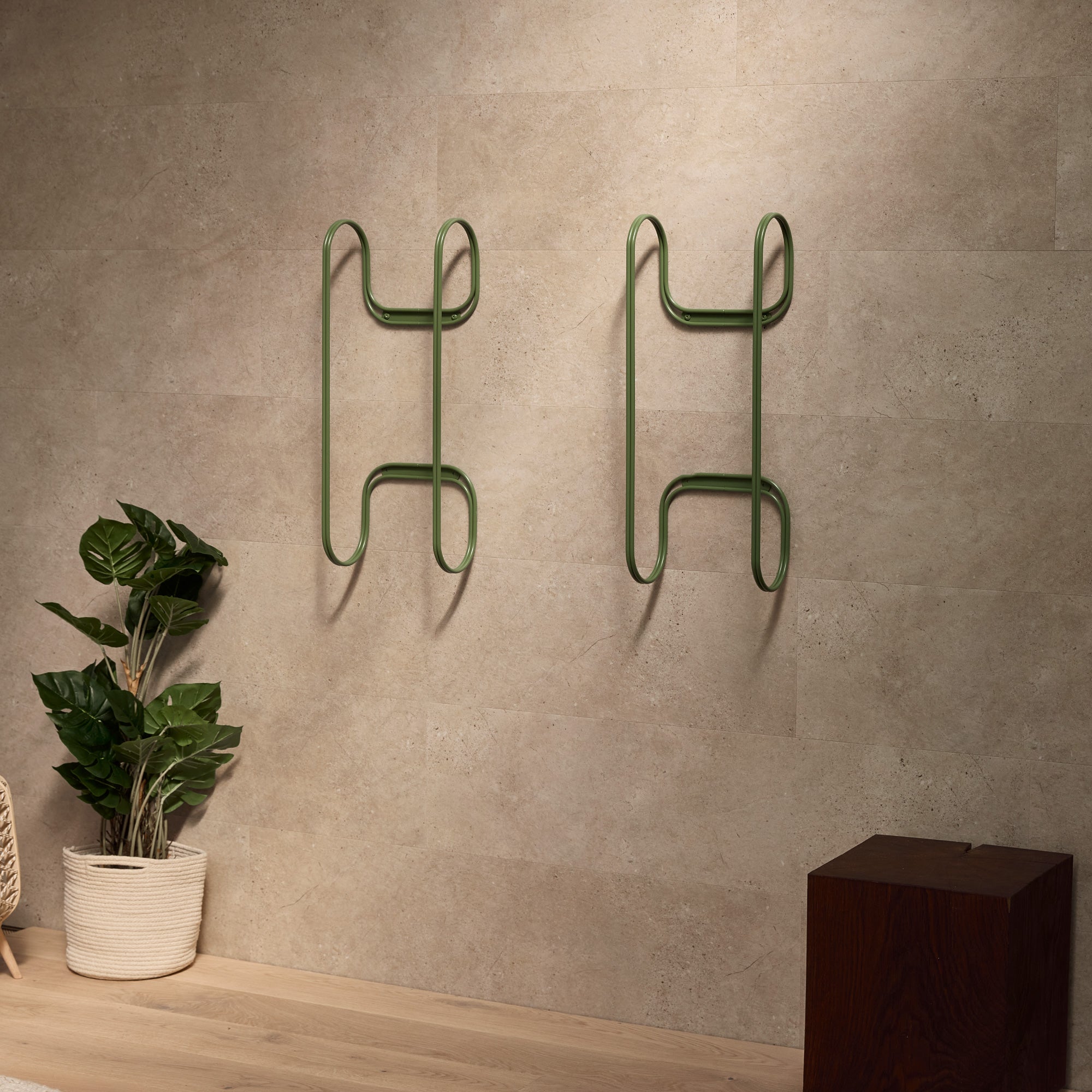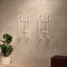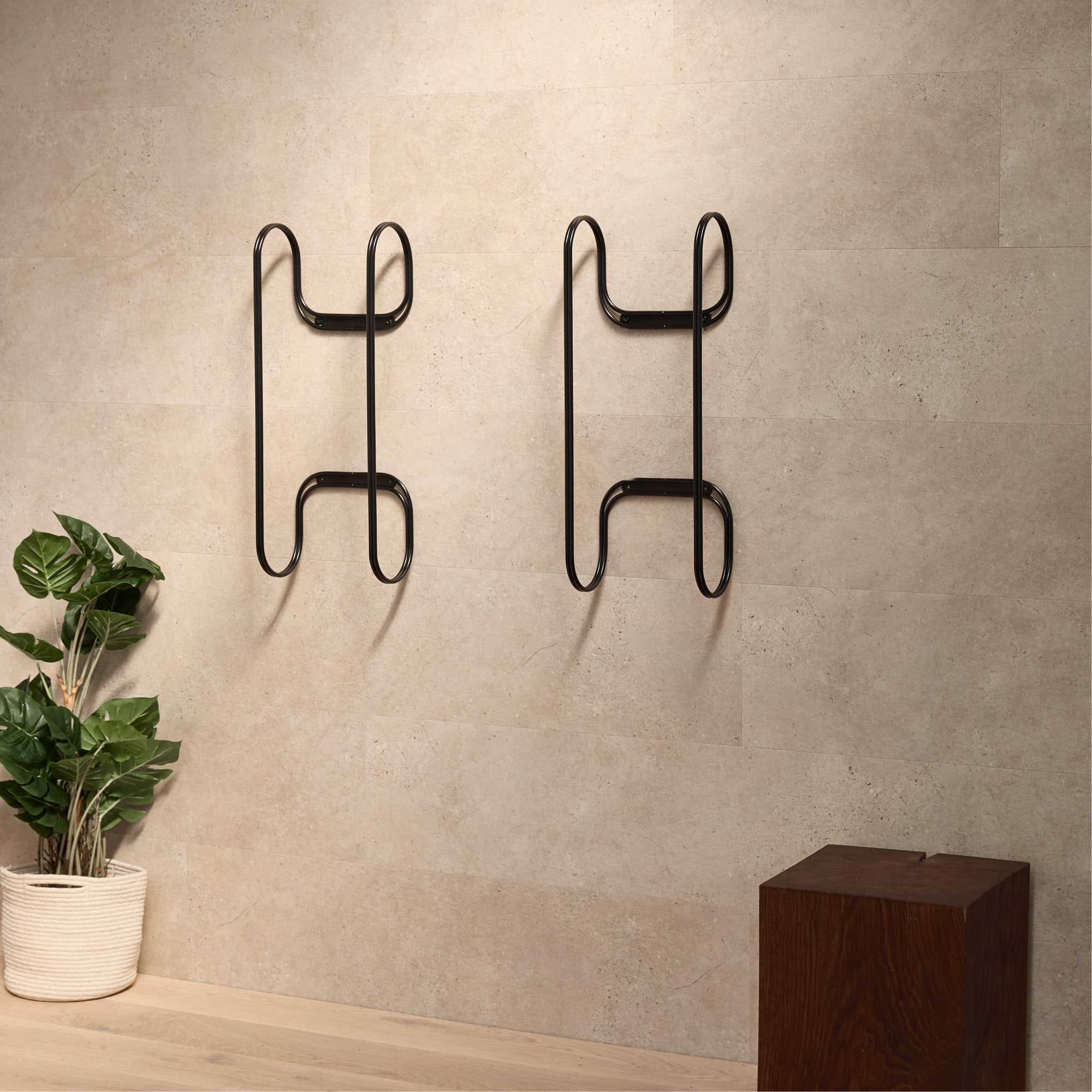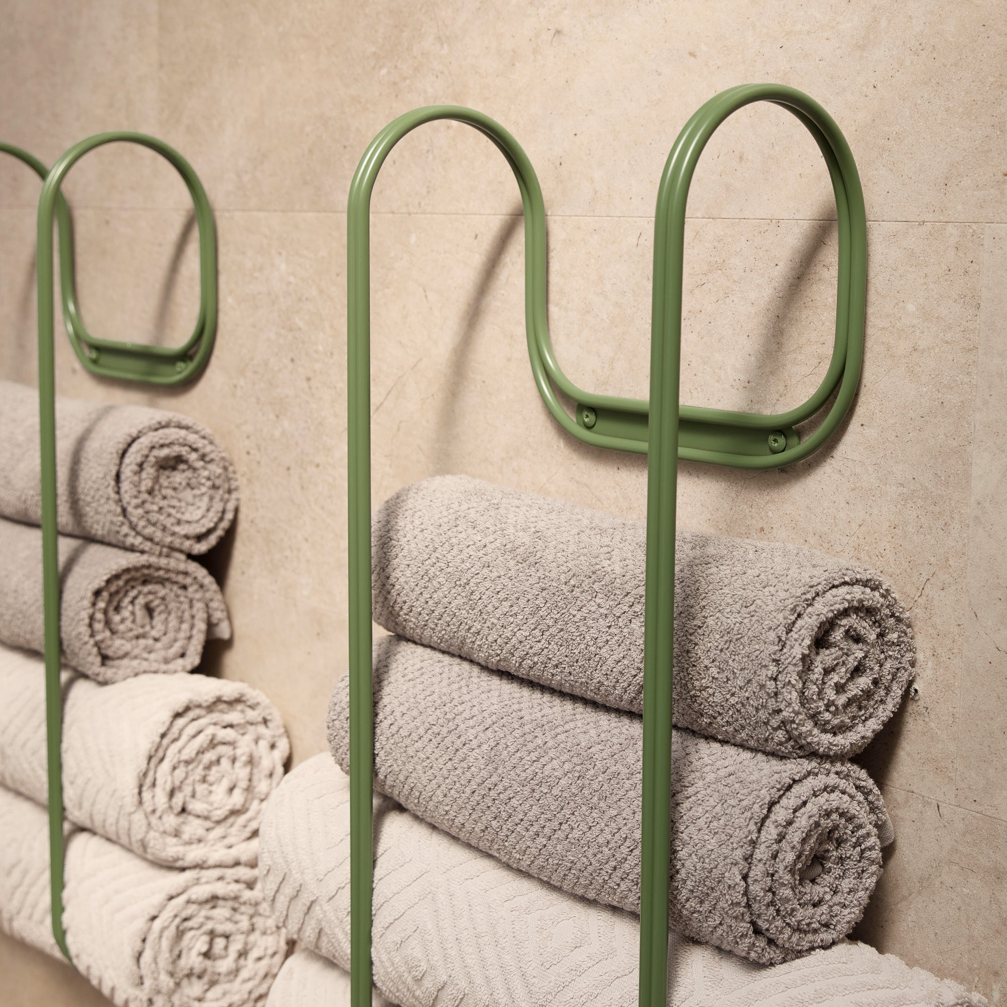 Lavna est la solution parfaite pour un rangement élégant des serviettes au mur. Le porte-serviettes moderne se fixe solidement avec seulement quatre vis et peut accueillir jusqu’à six serviettes enroulées à partir de 140x70 cm. Les petites serviettes peuvent être posées par-dessus pour gagner de la place, et même les grandes serviettes de bain trouvent élégamment leur place. Les courbes douces du cadre métallique thermolaqué et le design minimaliste permettent à Lavna de s’intégrer harmonieusement dans chaque concept de salle de bains – qu’il soit moderne, puriste ou classique.